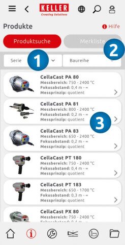 시리즈 및 모델 (1) 또는 관심 목록 (2)을 통해 고온계의 제품 검색을 시작하세요. 시리즈 (3) 를 선택하면 해당 장치 유형에 대한 제품 설명, 모든 기술 데이터 및 문서를 확인할 수 있습니다.
