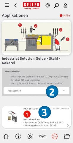 산업 솔루션 가이드는 산업 (1) 과 어플리케이션을 선택한 후 생산 공장의 측정 지점 (2) 에 적합한 측정 시스템 ( 3 )을 선택하는 데 사용됩니다. 선택한 어플리케이션 솔루션에 대한 모든 정보와 문서를 확인할 수 있습니다.